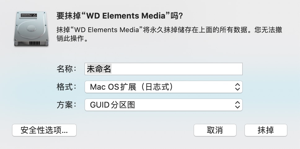 5. 确保格式为 “Mac OS 扩展日志”, 并确保该方案设置为 “GUID 分区图”