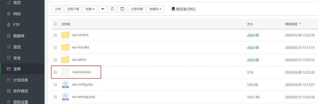 这个时候,我们可以使用 宝塔面板或者FTP 进入网站的根目录,删除 .maintenance 文件, 然后刷新网页就可以恢复正常访问。