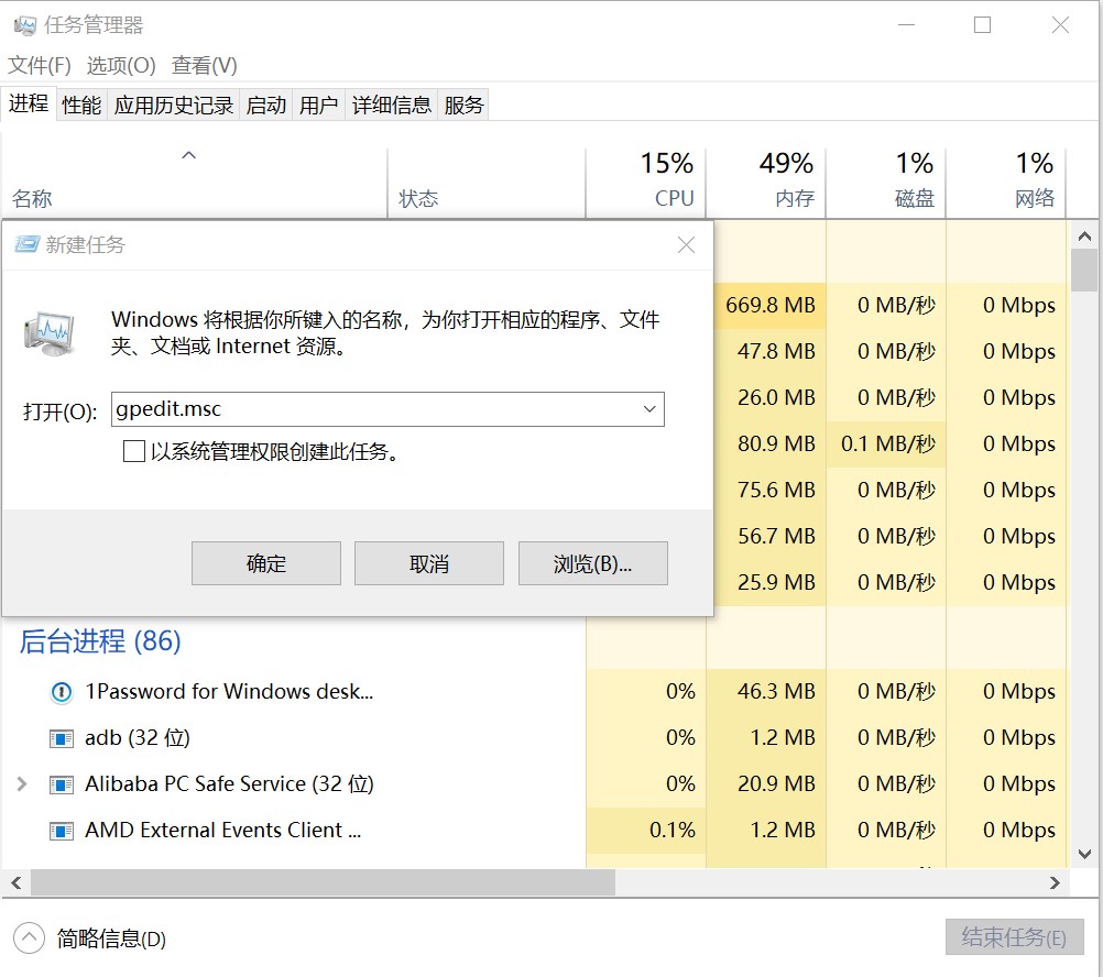 1.在Windows10系统桌面,右键点击桌面底部任务栏的空白位置,在弹出菜单中选择“任务管理器 ”菜单项,在打开的任务管理器窗口中,依次点击“文件/运行新任务”菜单项,在打开的Windows10运行窗口中(或者键盘快捷键win+R),输入关键词gpedit.msc,然后点击确定的按钮运行该命令。