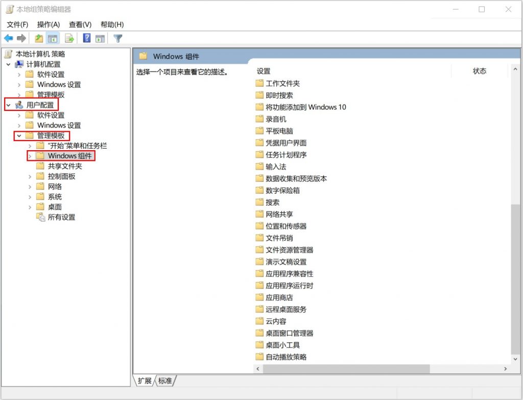 2.在打开的本地组策略编辑器窗口中,依次点击“用户配置/管理模板/Windows组件”菜单项。