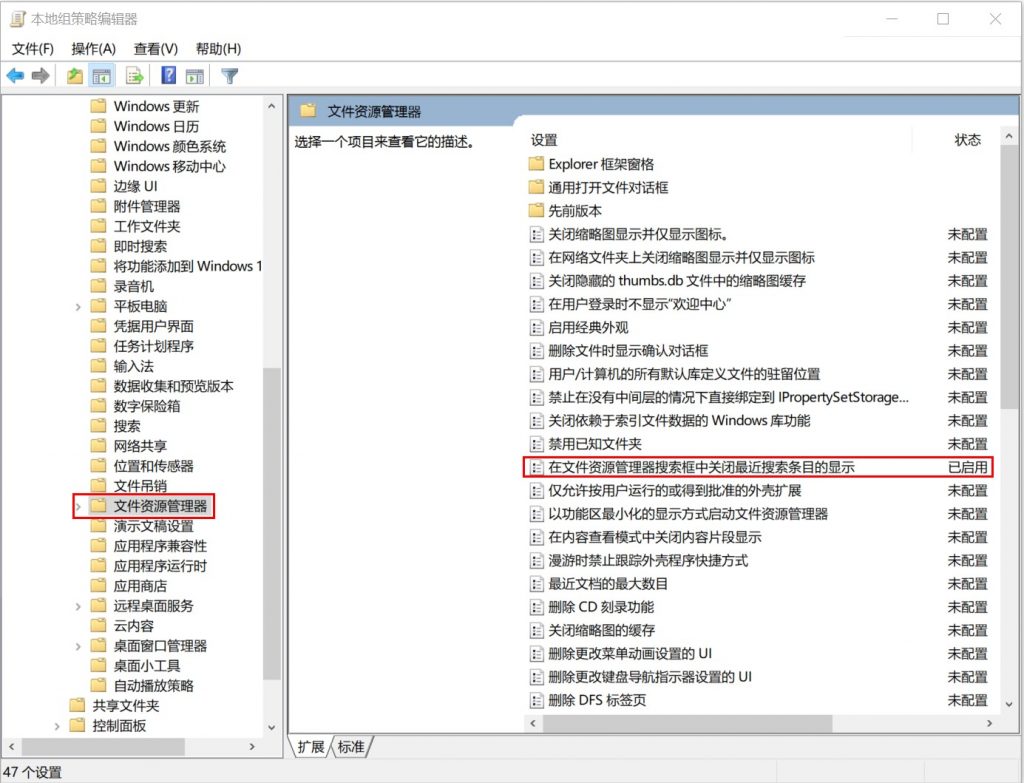 3.在展开的Windows组件菜单中找到并 点击“文件资源管理器”菜单项,同时在右侧窗口中点击“在文件资源管理器搜索框中关闭最近搜索条目的显示”一项,鼠标双击该栏,在弹出菜单中选择“编辑 ”菜单项,在打开的设置项编辑窗口中,将未配置改为“已启用”一项,最后点击确定按钮,这样以后就不会在搜索框中显示最近的搜索关键词了。