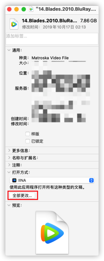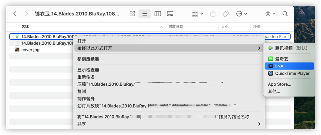 那么该文件就会在刚刚选择的应用程序(本例为 IINA)内打开,并且该文件以后也会默认以这个应用程序打开。