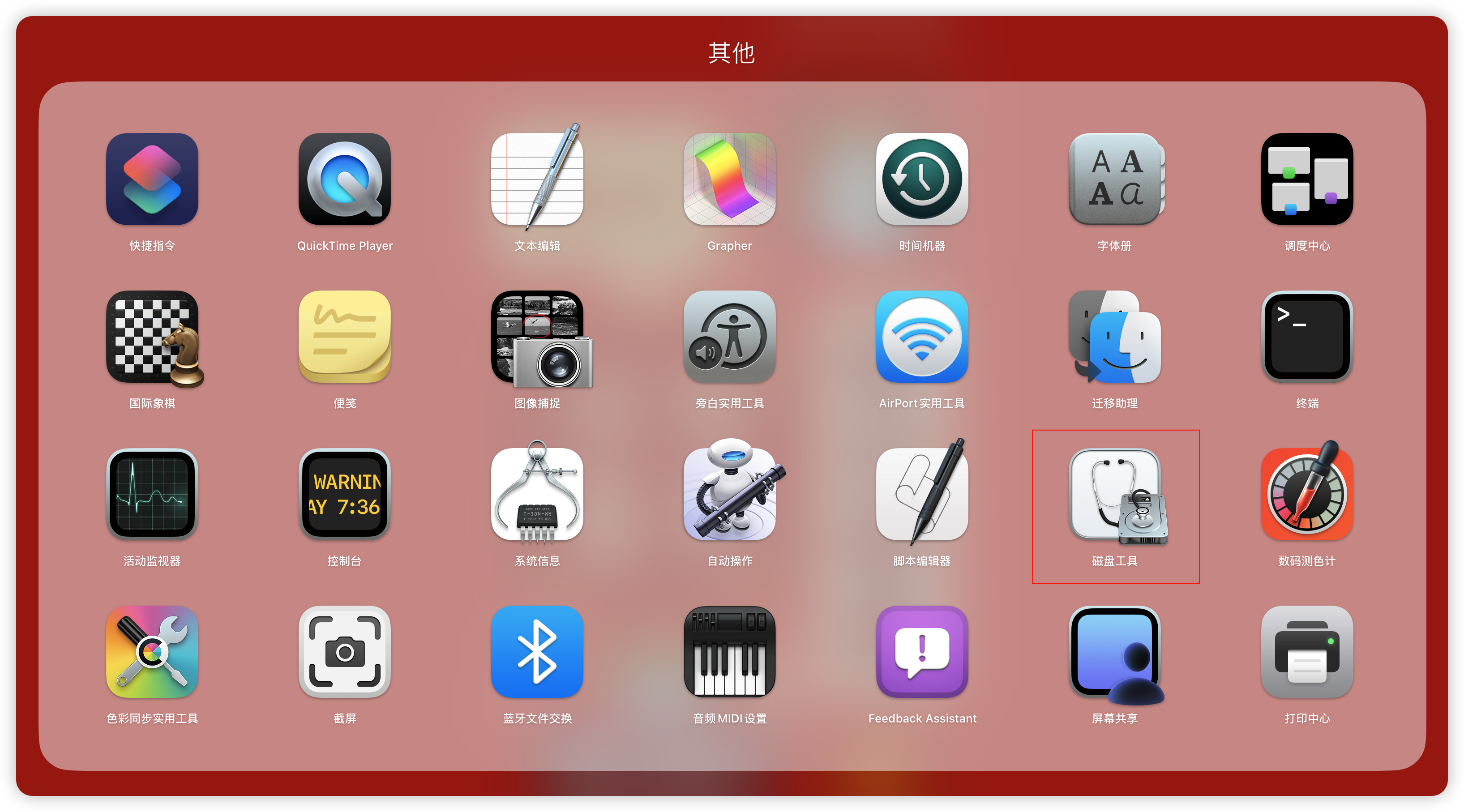 在“访达”->“其它”中找到“磁盘工具”并打开(或者通过 Command+空格,直接搜索打开)